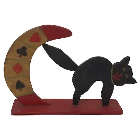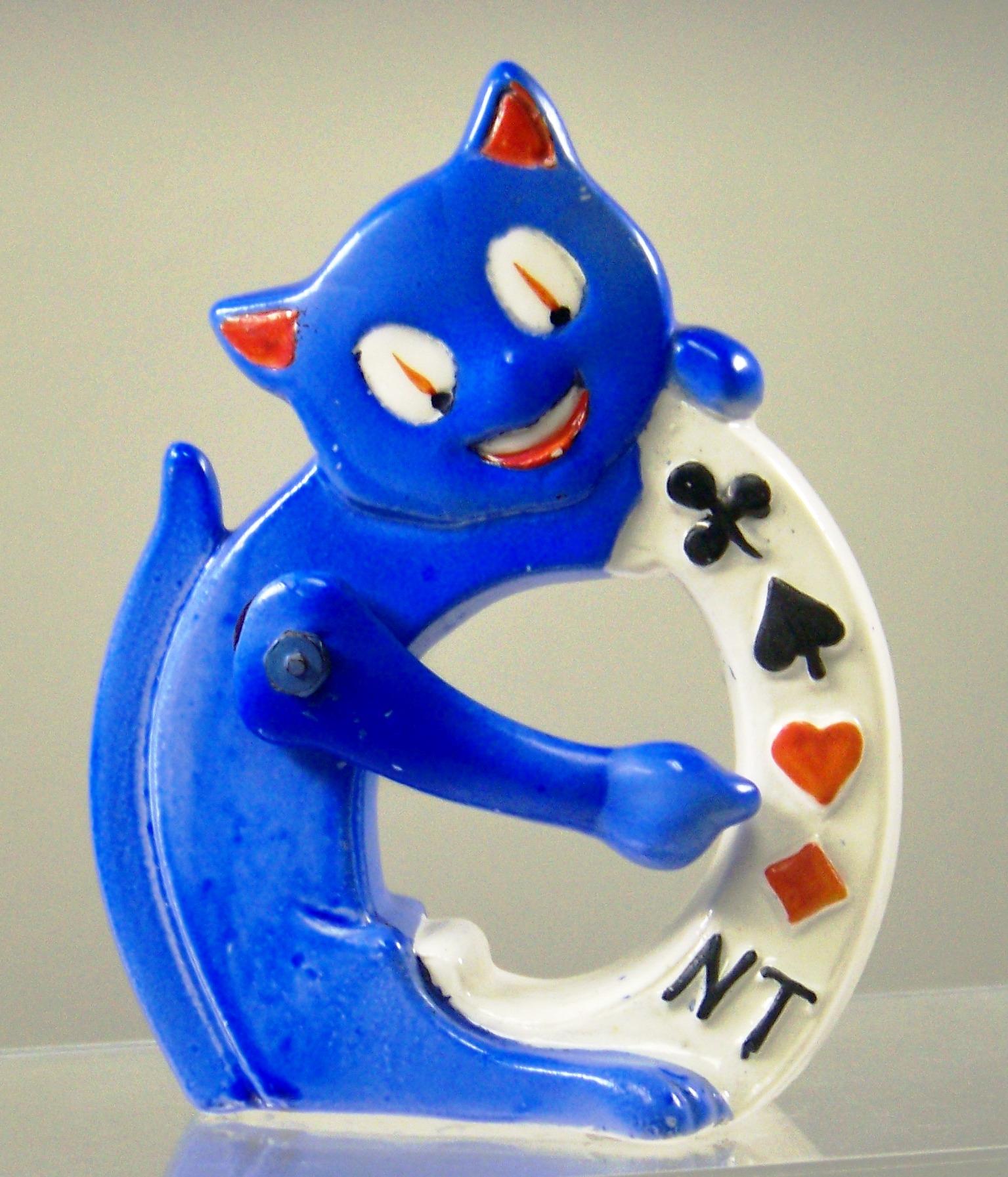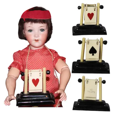 Schepps’s collection showcases a diverse array of trump indicators, featuring representations of various aspects of society, including individuals, animals, professions, sports, and beloved characters from cartoons and popular culture. This collection mirrors the societal trends prevalent in late 19th and early 20th century Europe and America. The age of these indicators is often determined by whether they include a “no trump” option – a feature absent in older models designed for traditional Whist, which originally did not have a ‘not trump.’ option. The materials used in these pieces, such as early plastics like Celluloid (patented in 1870) and Bakelite, also help in dating them. And their style gives away their era, whether it’s the ornate Victorian designs or the sleek Art Deco look, as well as their depiction of popular characters from contemporary comics and early animation – examples include Jiggs, Felix the Cat, Betty Boop, Mickey Mouse, and W.C. Fields.